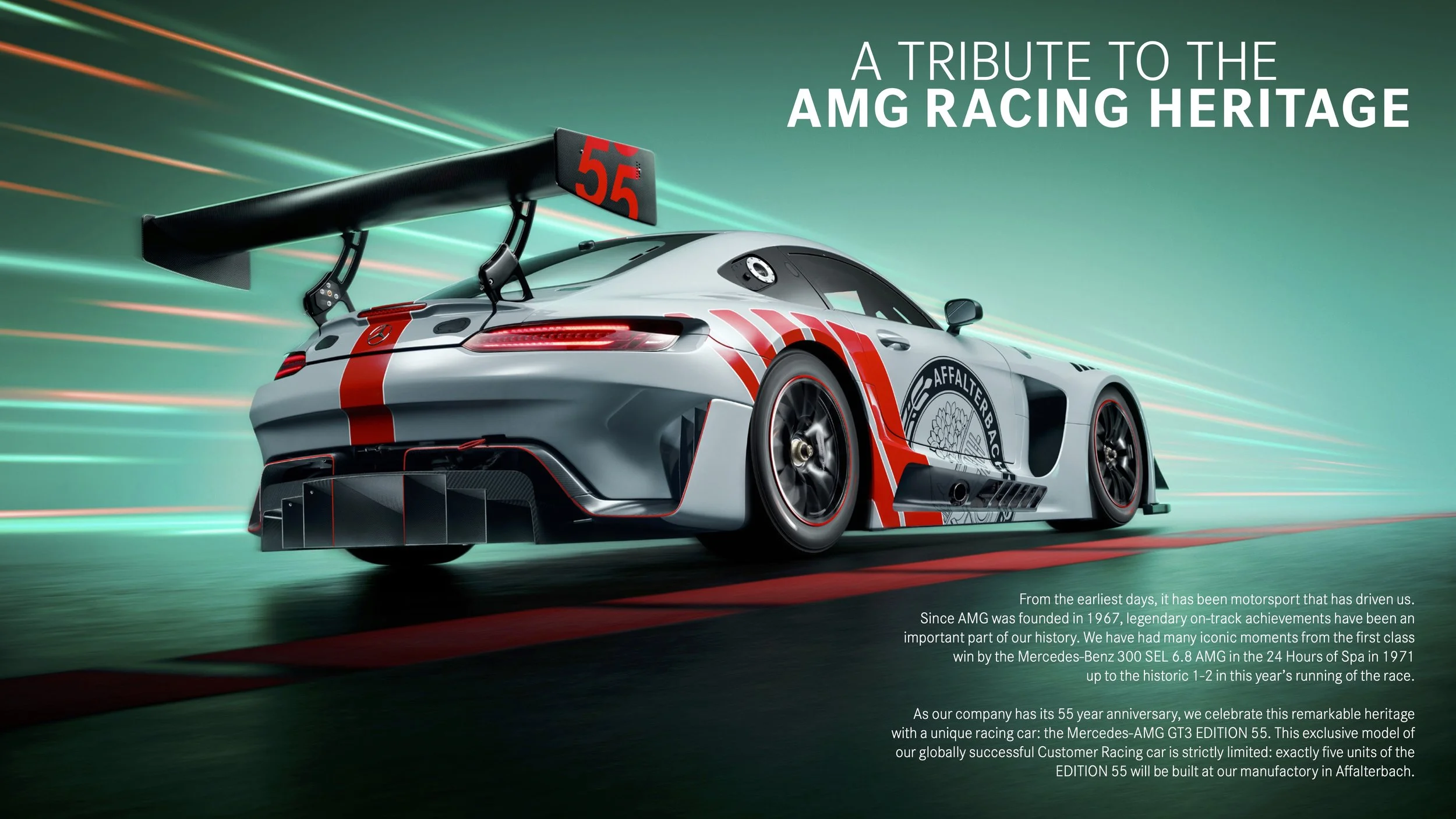 As Mercedes-AMG hits its 55 year anniversary, we celebrated their remarkable heritage with a unique racing car: the Mercedes-AMG GT3 EDITION 55.
